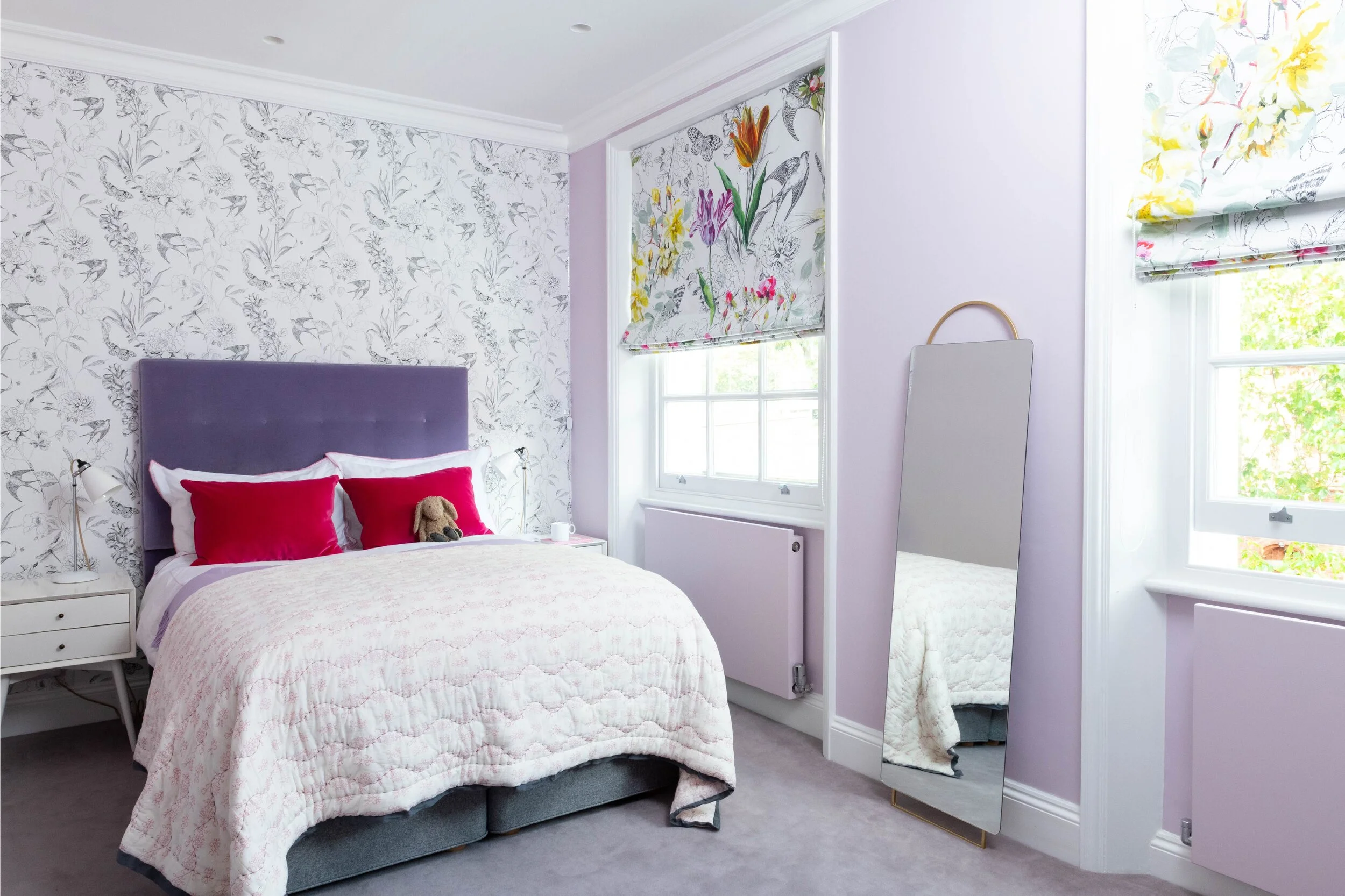 My client's daughter had recently started secondary school and wanted a more grown up feel for her bedroom and a bigger bed! My client and her daughter had already selected the lilac paint colour before I came on board. I added the elegant black and white wallpaper and pretty floral fabric for contrast and to give the scheme a more sophisticated feel. The scheme can be tweaked as my client's daughter gets older by changing bedding, cushions or the paint colour. I sourced a bed, headboard, lighting and furniture for a study area.